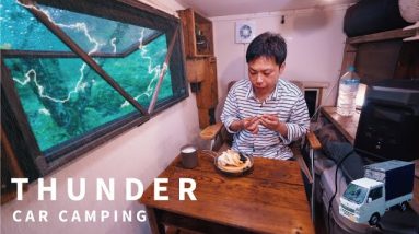 Thunder rumbling! Car camping on a rainy tropical night. Cold Chinese food is delicious.Truck camper